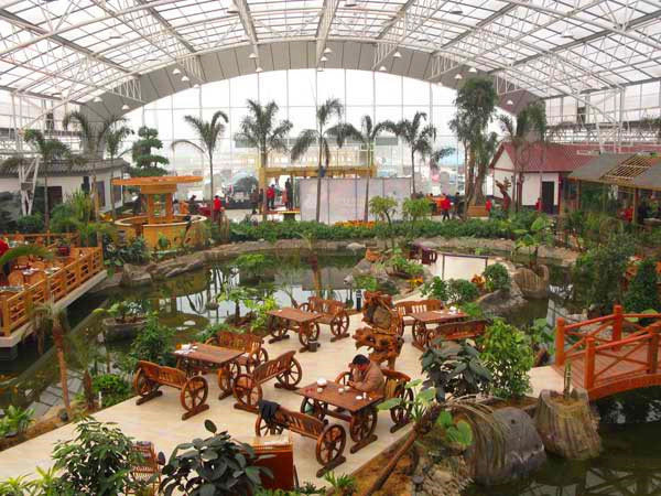 生態餐廳:生態餐廳又稱“綠色餐廳”,是現代都市倡導的一種新的休閑理念,是近年來人們對健康飲食的追求和對田園風光的向往而興起的一種新型餐飲形式。與傳統餐廳的功能相比,生態餐廳更加注重人與自然的和諧,人與環境的綠色平衡,是通過現代化智能溫室和原生態自然景觀的有機融合,營造一種綠色、健康的就餐環境;并通過溫度、濕度的控制,達到室內四季如春。